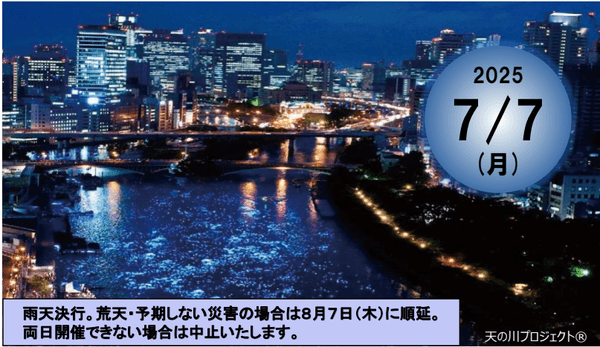 一般社団法人おしてるなにわ(代表理事:加藤好文 京阪ホールディングス株式会社 代表取締役会長CEO)は、2025年7月7日(月)に天満橋・大川およびその周辺(八軒家浜等)で「令和OSAKA天の川伝説2025」を開催いたします。
