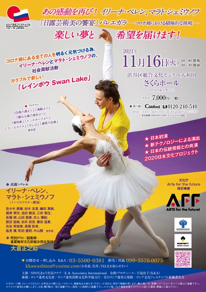 特定非営利活動法人 ちきゅう市民クラブによる『イリーナ・ペレン、マラト・シェミウノフと共演する「日露芸術美の饗宴・バレエガラ」-コロナ禍における積極的な挑戦-』が2021年11月16日 (火)に渋谷区文化総合センター大和田 さくらホール(東京都渋谷区)にて上演されます。チケットはカンフェティ(運営:ロングランプランニング株式会社、東京都新宿区、代表取締役:榑松 ⼤剛)にて発売中です。