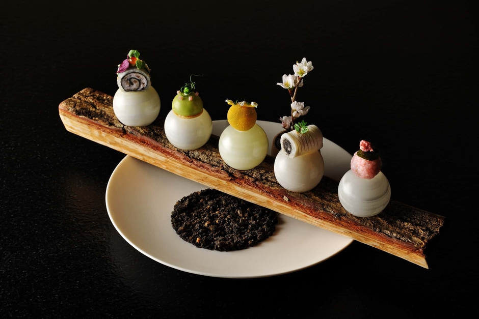 五味(酸・塩・苦・辛・甘)をそれぞれ小さな料理に詰め込み、繊細な技術で表現した星のや東京総料理長 浜田 統之の代表的な料理の一つです。料理の味付けには、しば漬けや塩辛といった日本で古くから親しまれてきた発酵食品を使用しています。えんどう豆の風味と甘みを感じることのできるえんどう豆味噌、豆腐を麹につけ、塩水で発酵させた腐乳、鯖のぬか漬けといった、フレンチでは珍しい発酵食品も取り入れています。