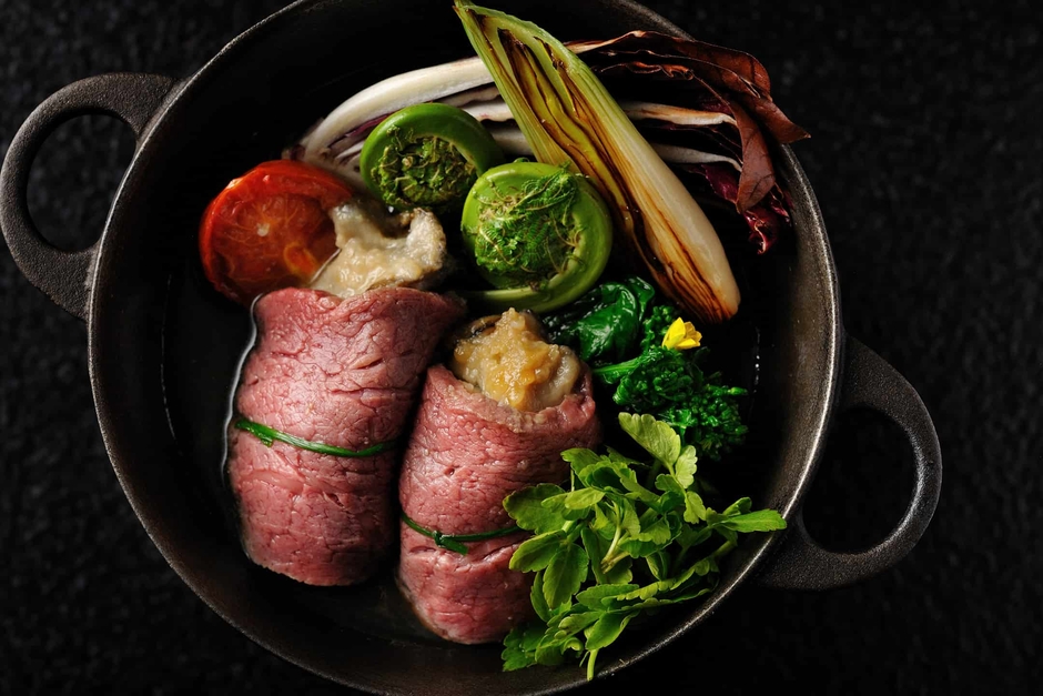 西京味噌漬けにした牡蠣を牛フィレ肉で包み、牛肉と牡蠣の旨味が出たスープとともに味わう一皿です。フィレ肉のもつ上質で繊細な脂分の甘みと、牡蠣のクリーミーな甘みは相性ぴったりです。せりや菜の花、こごみといった苦みのある春野菜と、酸味のあるトマトのコンフィ(食材を油に浸し、じっくりと煮るフランス料理の調理技法)を合わせることで、滋味深い春らしい味わいになります。