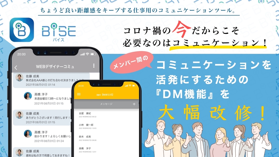 今回のスマホアプリ「BiSE」のバージョンアップにより、各個人間のコミュニケーションをさらに活発にするために、ダイレクトメッセージ(DM)機能を強化しました。