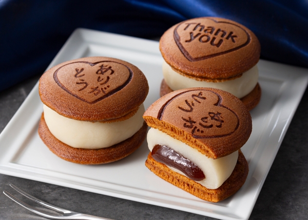 とろ~り柔らかなほろ苦い風味のキャラメル求肥を、北海道練乳と沖縄県産海水塩を加えた塩ミルクあんで包み、キャラメル風味のどら焼生地で挟んだミニサイズのどら焼です。天面には「ありがとう」と「thank you」の2種類の焼き印をおしています。感謝の気持ちを面と向かって言うのは恥ずかしい…!なんて方にもおすすめの商品です。