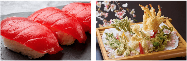 左:まぐろの王様、本まぐろの握り寿司。さらに、脂乗りと上品な白身の美味しさが楽しめる金目鯛の握り寿司もご用意いたしました。