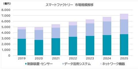 本レポートでは、「スマートファクトリー」の市場として、工場のスマート化の土台となる製品・サービスを調査対象とする。具体的には、生産設備からデータを収集する「制御装置・センサー」、データを蓄積・分析して活⽤する「データ活⽤システム」(主にソフトウェアやクラウドサービス)、工場内ネットワークを構築する「ネットワーク機器」の市場を含む。