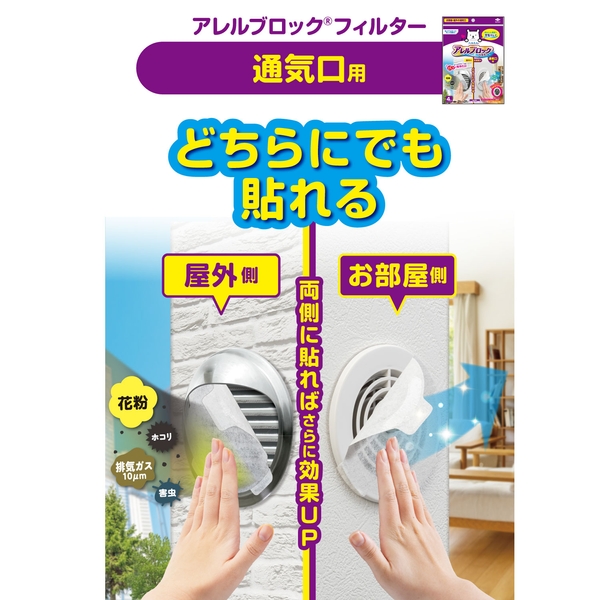 シールのようにすき間なく「パッ!」と貼るだけで取り付けられるアレルブロックフィルター(通気口用)が、花粉・ホコリ・排気ガスなどのアレル物質をキャッチして除去し、汚れた空気の侵入をブロックして、おうちの中にキレイな空気を取り込むことができます。