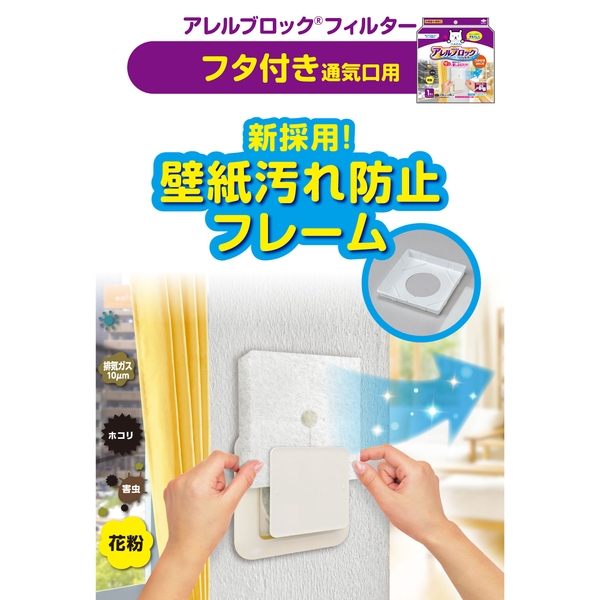 抗アレル物質加工が施されているため、室内の通気口にサッと差し込むだけで、誰でも簡単に取り付け・取り外しができるアレルブロックフィルター(フタ付き通気口用)が、花粉、ホコリ、排気ガスなどのアレル物質をキャッチして除去し、おうちの中にキレイな空気を取り込むことができます。