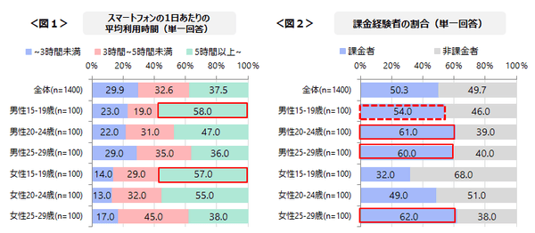 全体では、1日のスマートフォンの利用時間が「5時間以上」が、37.5%であるのに対し、男性15~19歳では58.0%。女性15~19歳では、57.0%と、他の世代と比べ、「5時間以上」のスマートフォン利用の割合が最も高い。<図1>