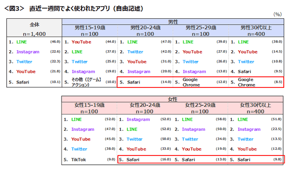 男性30代以上を除く、全ての性年代で、上位4項目が「LINE」「Instagram」「「YouTube」「Twitter」のラインナップ。なお、20代以上では、上位5項目目に「Safari」や「Google Chrome」といった”検索ブラウザ”がランクイン。デジタル・ネイティブ世代である10代の特徴なのか、ライフステージの変化に伴うものか、今回の調査では断言できないものの、若年層での情報収集の手段として、SNSによる検索が主流になってきていることが、仮説として考えられる。<図3>