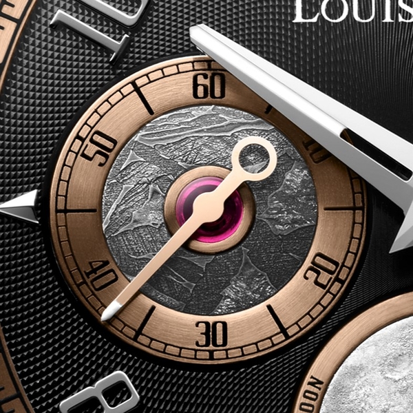 6時位置のムーンフェイズ表示は、発光塗料で手描きした月をモチーフとする回転ディスクに、クレーターに由来する濃いブラックの月隕石(ドファール457)をセットしています。ドファール457は、ルイ モネCEOのジャン=マリー・シャラーと親交が深い隕石ハンターのリュック・ラベンヌが、2001年にオマーンのドファール砂漠で発見しました。