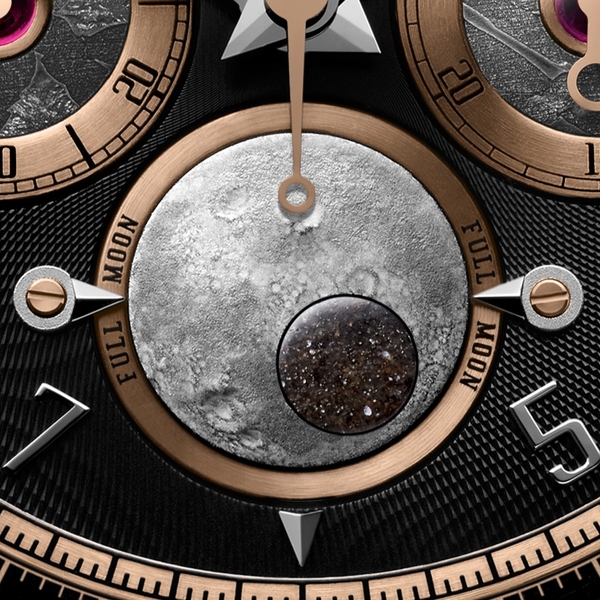 従来のムーンフェイズ表示と異なり、月相表示が隠れることなく月隕石を鑑賞することができ、満月の日に左右両端のポインターに到達するように月隕石が周回します。