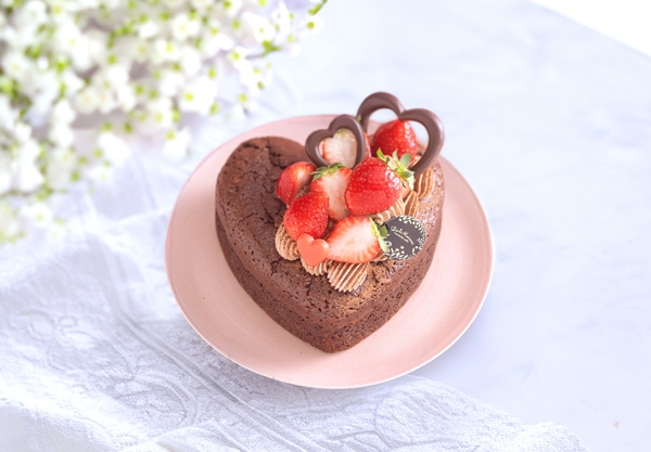 しっとり焼き上げた濃厚なガトーショコラ。甘酸っぱいいちごを飾り、可愛らしいハートチョコレートをあしらいました。