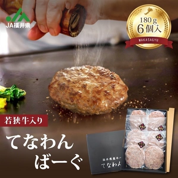 若狭牛と国産の豚肉でつくったハンバーグです。福井弁で「やんちゃ・気が強い」などを意味する「てなわん」と「ハンバーグ」を掛け合わせた「てなわんばーぐ」を食べて、心も体も「てなわん」ほど元気にたくましく育って欲しいという願いを込めて名付けました。