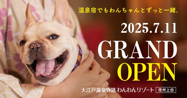 2025年7月11日にリニューアルオープンする「大江戸温泉物語わんわんリゾート 信州上田」(以下、わんわんリゾート 信州上田)の宿泊予約を5月8日(木)より開始いたしました。「大江戸温泉物語わんわんリゾート」シリーズは大江戸温泉物語グループ全体で3施設となります。