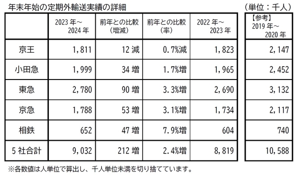 年末年始の定期外輸送実績は、前年から 2.4%増加【神奈川県内大手民鉄5社】