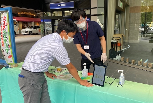 今回、カゴメ株式会社に協力いただき、日頃の野菜摂取量が推定できる「ベジチェック」を会場に設置。会場となったオフィスビルで働くオフィスワーカーの皆様に、「ベジチェック」体験と、「OFFICE DE YASAI」の商品「やさいDELI」の配布を実施いたしました。
