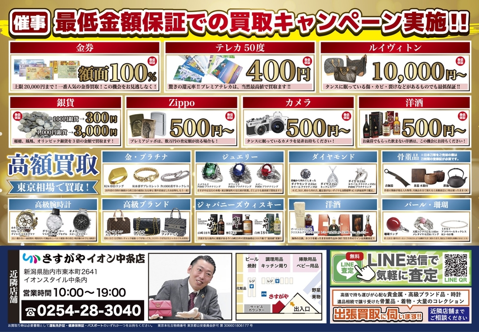 買取専門店さすがやは、2026年4月3日(金)〜4月7日(火)・4月10日(金)〜4月14日(火)の期間、イオン村上肴町店にて期間限定の買取催事を実施いたします。