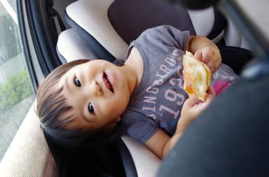 「娘と二人、パン屋さんからの帰り道。急に静かになった後部座席を振り返ると、先ほど買ったドーナツと砂糖だらけの笑顔がありました。