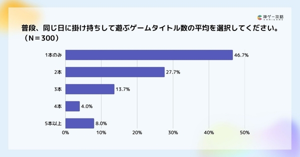 同日に掛け持ちして遊ぶゲームタイトルの数は、1本のみが46.7%と最多でした。また、約半数が同じ日に1本のゲームしかプレイしない一方で、5本以上という回答が8%と少なからずいる結果となりました。