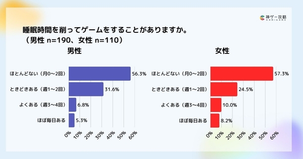 睡眠時間を削ってゲームをすることは、男女ともにほとんどない結果となりました。