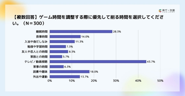 ゲーム時間を調整する際に優先して削る時間は、テレビ/動画視聴の時間が43.7%で最多でした。次点で睡眠時間と、読書や趣味の時間より睡眠時間を優先して削ることが分かりました。