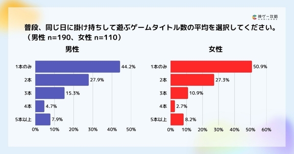 同日に掛け持ちして遊ぶゲームタイトルの数は、男女別の調査では、1本のみの回答に若干の差があるものの、全体的にほぼ回答に差がない結果となりました。