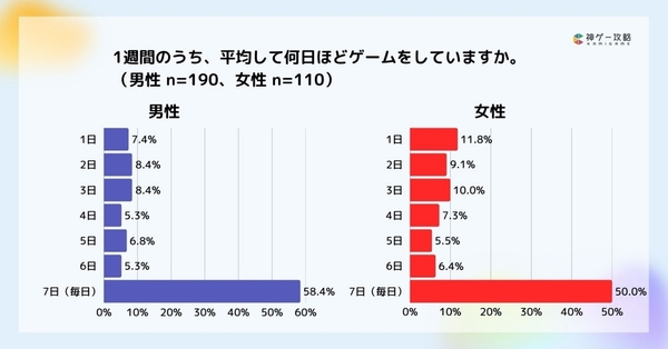 1週間のゲームプレイ日数は、男女別ともに7日(毎日)が過半数以上