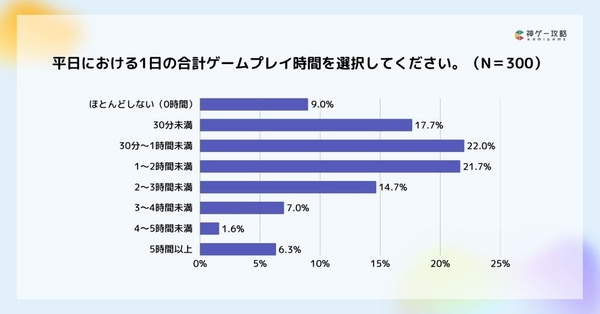 平日1日当たりのゲームプレイ時間は、30分〜1時間が22%で最多でした。次点で1〜2時間の21.7%であり、7割弱が2時間未満という結果になりました。