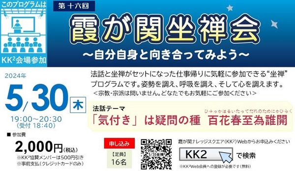 霞が関ナレッジスクエア(略称:KK² 所在地:東京都千代田区 運営:一般財団法人AVCC 理事長:久保田了司)は、2017年から仕事帰りに気軽に参加できる“坐禅”イベントとして「霞が関坐禅会」を開催してまいりました。この度、5月30日(木)に第十六回目となる霞が関坐禅会〜自分自身と向き合ってみよう〜を開催いたします。