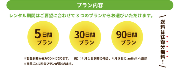 レンタル期間は5日間/30日間/90日間から選択でき、2,200円(税込)~レンタルが可能です。※わんトライ便+はクレジット支払のみの対応です。