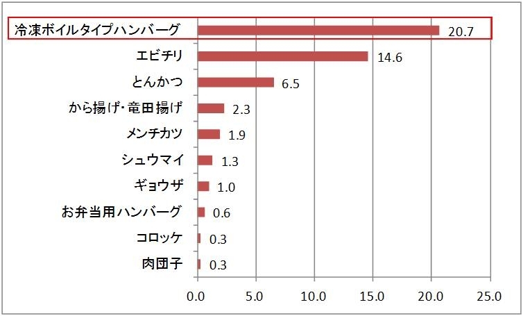 手軽に「本格的な味」が楽しめる、冷凍食品ですが、本調査で「ちょっと贅沢だと思う冷凍食品」について質問したところ、「冷凍ボイルハンバーグ」が20.7%で第1位、続いて、「エビチリ」が第2位(14.6%)、とんかつが第3位(6.5%)という結果となりました。