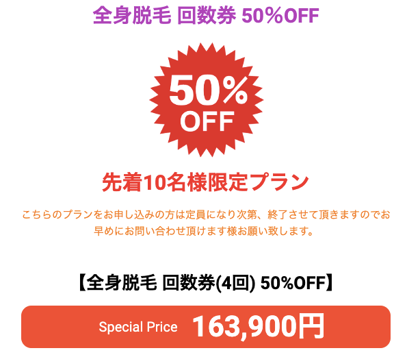 ・全身脱毛4回分回数券半額 163,900円(税込)