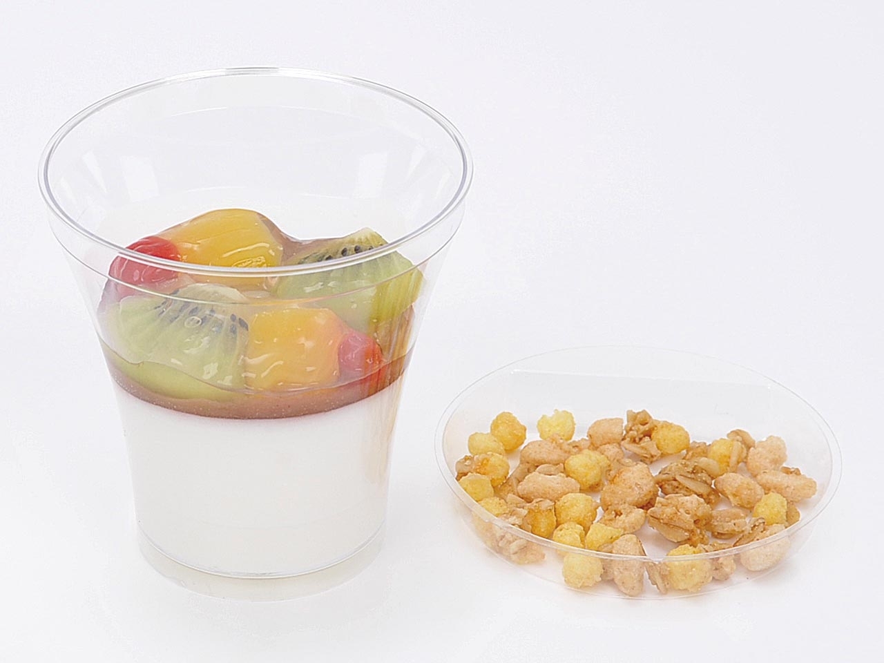 ヨーグルト風味の爽やかな味わいのムースに、アサイーソースを重ね、キウイ、マンゴー、白桃、赤すぐりのフルーツをトッピングしました。カップ上部に別添にしたグラノーラを、お召し上がり直前にかけていただくことで、さくさくとした食感を味わっていただけます。