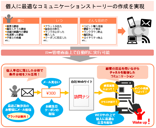 コミュニケーションシナリオイメージ「R∞」は2,000パターン以上の対象者抽出条件とチャネルを駆使して、顧客の反応を伺いながら実行するキャンペーンのシナリオを設計します。その設計に対し、メール、ディスプレイ広告、WEBサイト、スマホアプリなどを通して、一人ひとりに最適化されたコンテンツを提供し、パーソナルマーケティングで既存顧客の維持育成を実践するツールです。