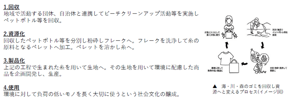 『UpDRIFT®』は海岸等で回収したペットボトル等を繊維の原料として資源化し、環境負荷の低い新しい製品として蘇らせるプロジェクトです。原料となるペットボトルは、地域活動団体や地方自治体、企業等と連携して行うクリーンアップ活動「Green and Blue Challeng®(グリーン アンド ブルー チャレンジ)」を通して回収し、分別や洗浄を行ってから資源化・製品化しています。