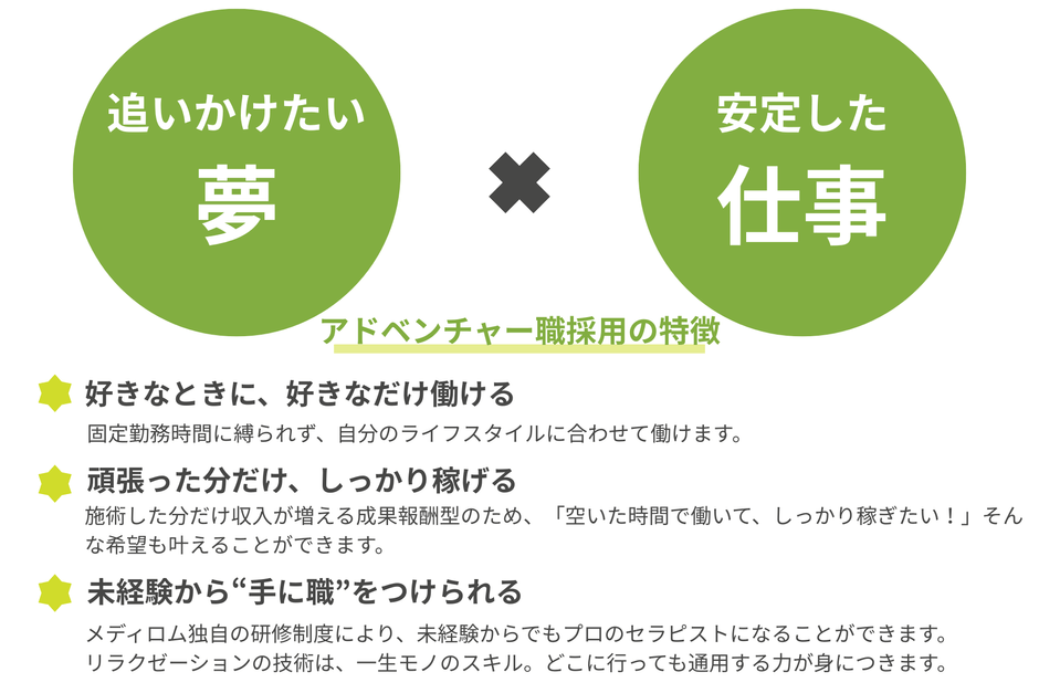 アドベンチャー職とは、「夢を追いかける人を応援する採用」です。リラクゼーションスタジオ「Re.Ra.Ku 」で働くセラピストの働き方として、時間に縛られて対価を得る勤務形態ではなく、実績に応じた報酬を得ることで自分が最も夢中である夢を追い続けながら働くことができます。そして新人補填制度や社内検定制度で歩合率を上げることが可能なため、未経験の方でも安心して挑戦でき、また、収入上限なく稼ぐことができます。