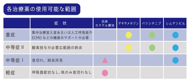 レムデシビルは中等症Iから重症まで、デキサメタゾンやバリシチニブなどは酸素吸入を必要とする中等症IIから重症で使われます。