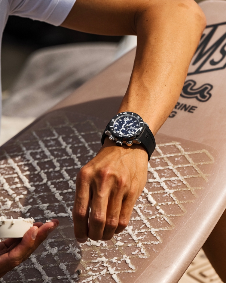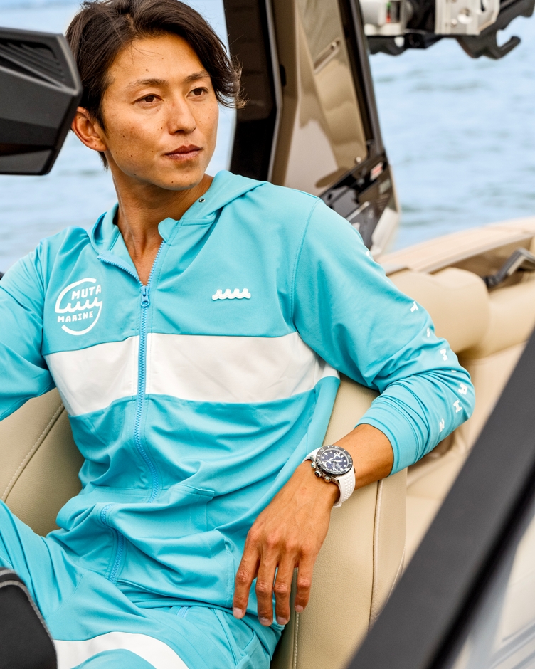 軽量チタン素材が腕への負荷を軽減しています。パワーボートの動力であるプロペラモチーフの刻印に、ムータ・マリンのシンボルマークを記した、コラボモデル限定のデザインです。刻印によってできる凹凸が、腕との密着を防ぎ、快適な装着を可能にします。“LIMITED EDITION 150”の文字入り。