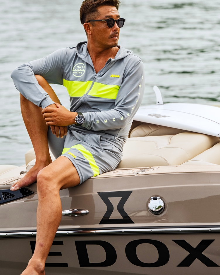 本限定モデルの発売にあたり、マリンアクティビティーのウェイクサーフィンを通してイメージ撮影を実施しました。米国カリフォルニア発のウェイクサーフィン専用ボートである「センチュリオン ボート」のムータデザインモデルに、エドックスのロゴを加え、本コラボのプロモーションを行なっていただきました。