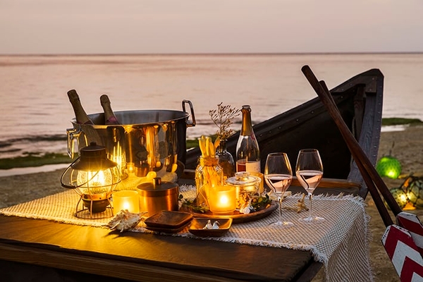 ハーリーの日に、人々が港に集まってご馳走やお酒を楽しんでいたという古事にちなみ、星のや沖縄の前の浜辺に、夕陽を眺めながらアペリティフを楽しむスペースが登場します。日中に海へ漕ぎ出ていたサバニをドリンクカウンターに変え、スパークリングワインなどの飲み物とスナックを楽しめます。サバニの周りには、漁網のブイに使用していたガラスの「浮き球」を使った照明が灯り、夕刻は幻想的な雰囲気に包まれます。水平線に沈む夕陽と空の色の移り変わりを、心地よい風の中で優雅に眺められます。