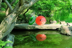青々とした緑の日本庭園に和傘の色が鮮やかに映えます。都立庭園にご来園の際は、和傘を差しながら夏ならではの庭園の風情をお楽しみください。