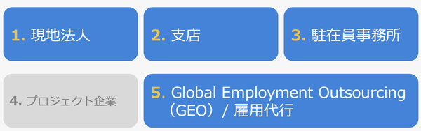 GEOは欧米の会社が世界展開するときにつかっている手法で、ベトナム現地のGEOサービス提供会社とサービス契約を締結などして、ビジネスが軌道にのるまで一時的に事業活動をするための事業形態です。