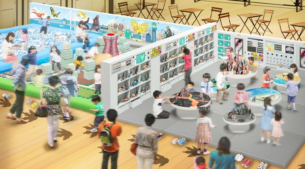 今夏にオープンした『カイジュウノモリ』は、ショップ&レストラン「モリノテラス」の一角に新設した子ども向けの遊び場です。約50種類の東宝特撮怪獣ソフトビニールフィギュアで遊べる「ソフビパークエリア」と、街を背景に建物型のクッションを壊しながらゴジラの世界観を楽しめる「カイジュウなりきりエリア」に分かれています。柔らかい素材を使用した安全な空間で、おもちゃを使って子どもたちが自由に楽しめるエリアです。