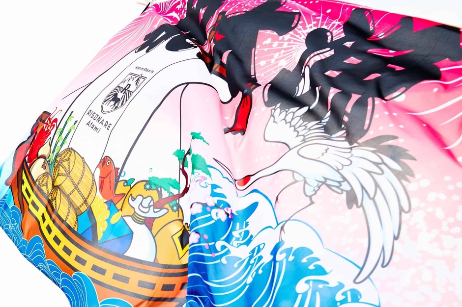 網を引き終えたら港に向かって大漁旗を掲げて帰港します。大漁旗は、熱海名物の花火や柑橘が描かれたリゾナーレ熱海オリジナルデザインです。