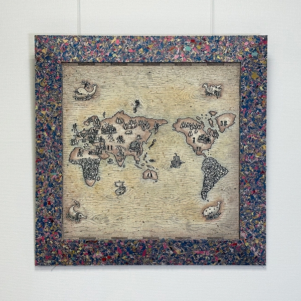 画家の濱口瑛士がファッションロス問題へのメッセージを、繊維リサイクルボードPANECOに描き、PANECOで製作した額縁で表装した作品。