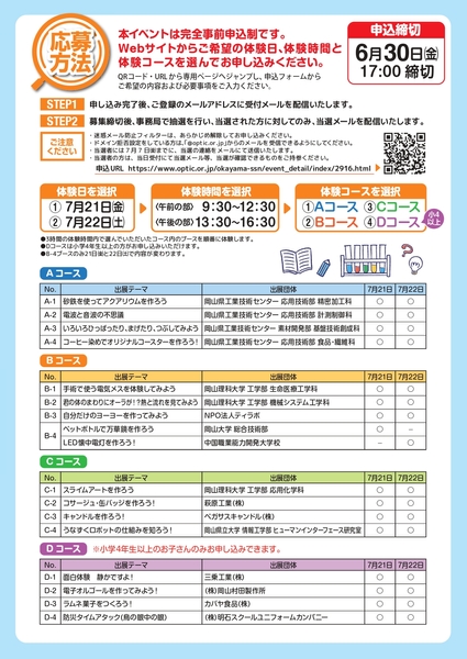 「おもしろ体験でぇ~」実行委員会では、県内のものづくりを支える拠点施設が集まっている「岡山リサーチパーク」を県民の皆さん、特に未来を担う子どもたちに一般公開し、科学技術やものづくりの素晴らしさを体験してもらう事を目的に毎年「おもしろ体験でぇ~」を開催しており、本学が参加しますので、ご紹介します。