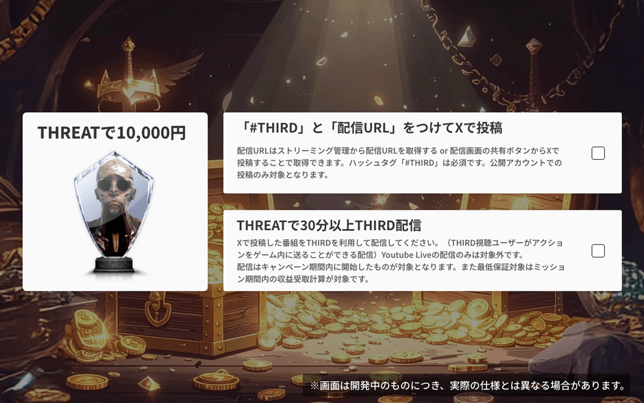 ※ミッション機能を活用するには、「THIRDへのストリーマー登録」と「対応ゲームでのTHIRDライブ配信」が必須条件になります。
