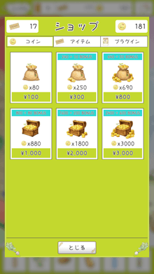 ショップメニューでは、コインやチケット、各種プラグインの購入ができます。