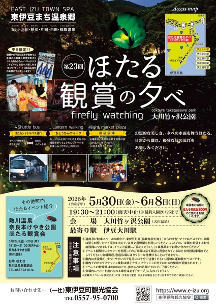 一般社団法人東伊豆町観光協会(所在地:静岡県賀茂郡東伊豆町:代表理事 加藤昌利)は 2025年5月30日(金)~6月8日(日)の10日間、わさび育つほたるの町、大川温泉にて第23回を数える「ほたる観賞の夕べ」を今年も開催します。伊豆の温泉旅行の道中で天城の麓を飛び交うほたるをお楽しみください。