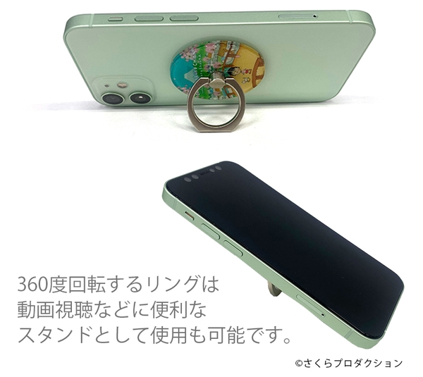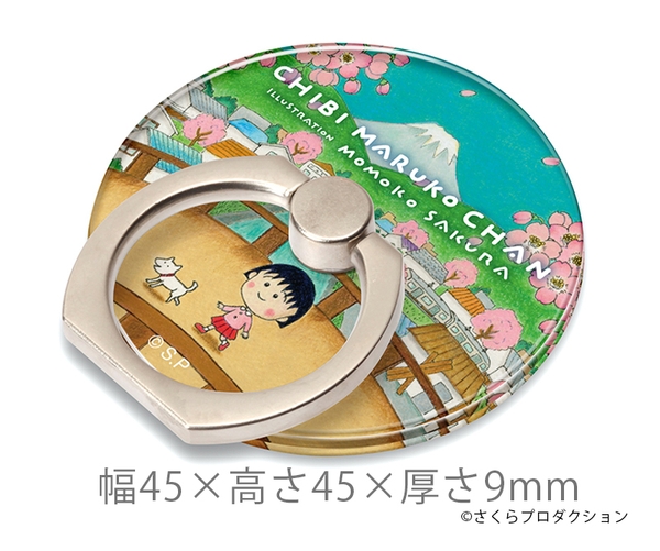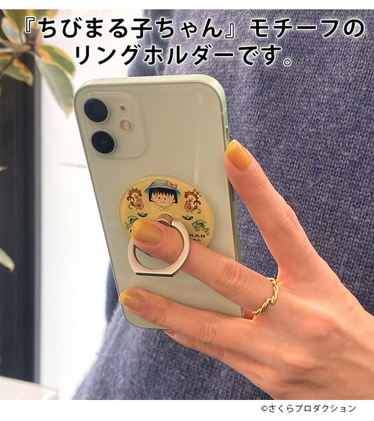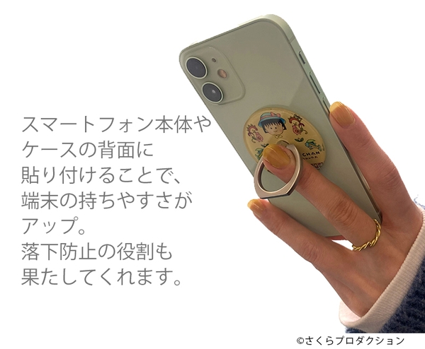 「ちびまる子ちゃん」の原画デザインのスマートフォンリングホルダーです。スマートフォン本体やケースの背面に貼り付けることで、端末の持ちやすさがアップします。落下防止の役割も果たしてくれます。360度回転するリングは動画視聴などの際に便利なスタンドとして使用も可能です。