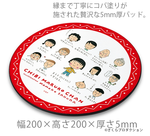 「ちびまる子ちゃん」の原画デザインのマウスパッドです。 縁まで丁寧にコバ塗りが施された贅沢な5mm厚パッド。裏面は滑り止めに優れた凹凸のあるラバー素材。表面は滑りが良く丈夫なポリウレタンレザーを使用しています。重厚な厚さがあり、直径20cmと広めなのでテレワーク時のマウス操作に最適です。